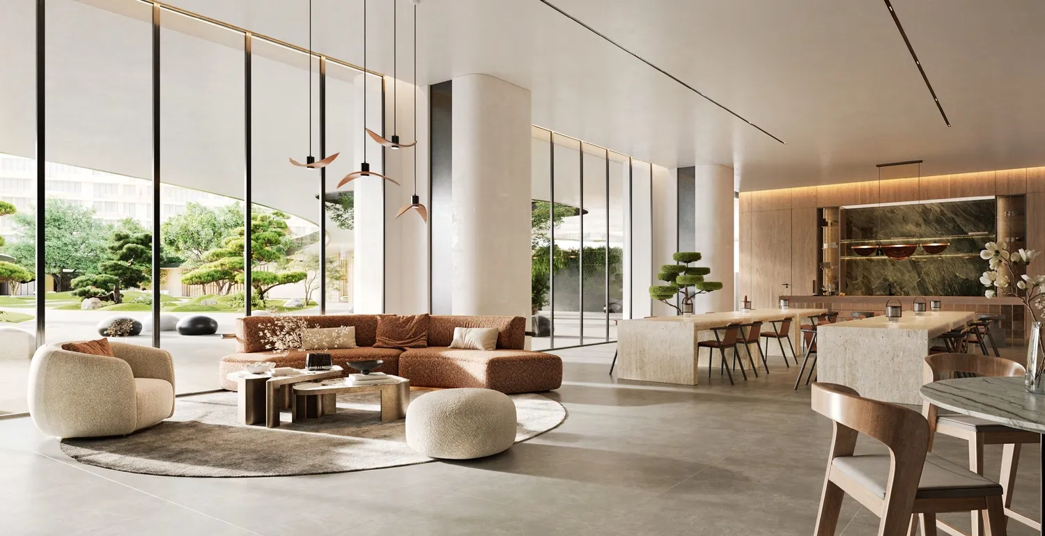 Interiors at Hado are defined by elemental, nature-inspired materials and a calm, contemporary aesthetic influenced by Japanese principles of simplicity and harmony. Finishes feature a refined palette of stone, warm timber, brushed metal accents, and soft textured surfaces, complemented by generous floor-to-ceiling heights and abundant natural light. Kitchens are crafted as sculptural spaces with stone countertops, timber cabinetry, and subtle metal detailing, designed for both functionality and quiet elegance. The residences are delivered unfurnished, allowing owners to personalize their homes while enjoying a high level of material quality, craftsmanship, and timeless design throughout.