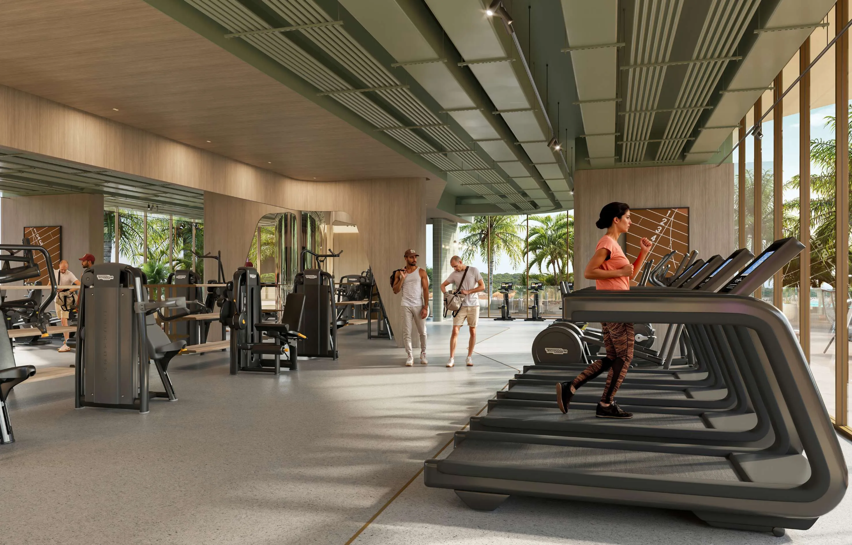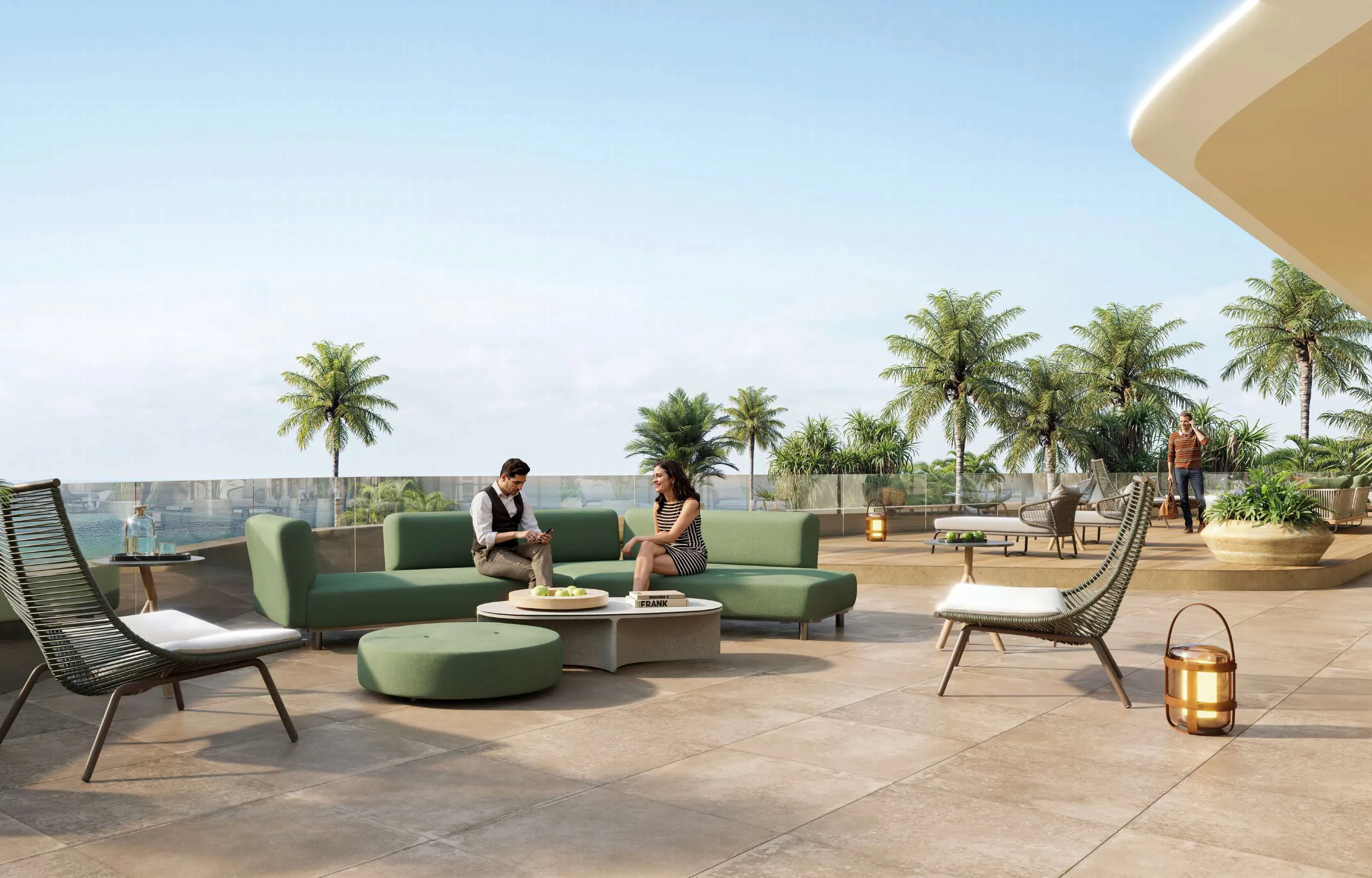 Inside, Palazzo Tissoli translates timeless craftsmanship into living form. Fully furnished studios and one-bedroom apartments reflect the balance between elegance and practicality — stone, wood, and glass form a warm, tactile palette, complemented by bespoke lighting and refined details. Floor-to-ceiling glazing dissolves the boundary between interior and exterior, framing the Arabian Gulf and the Wynn Resort as part of everyday life.