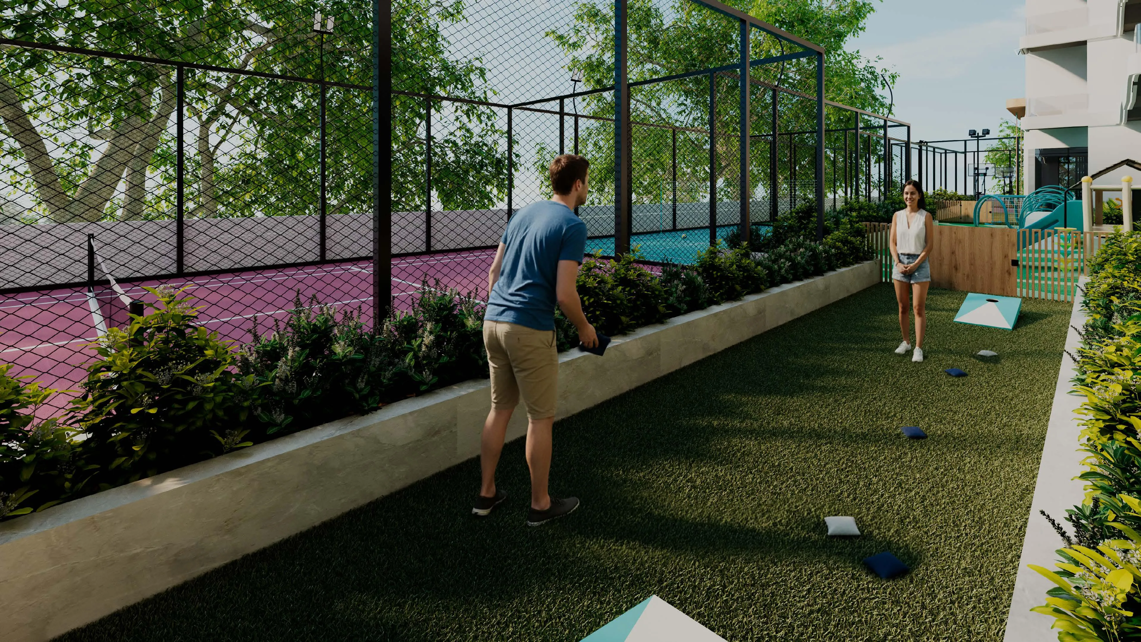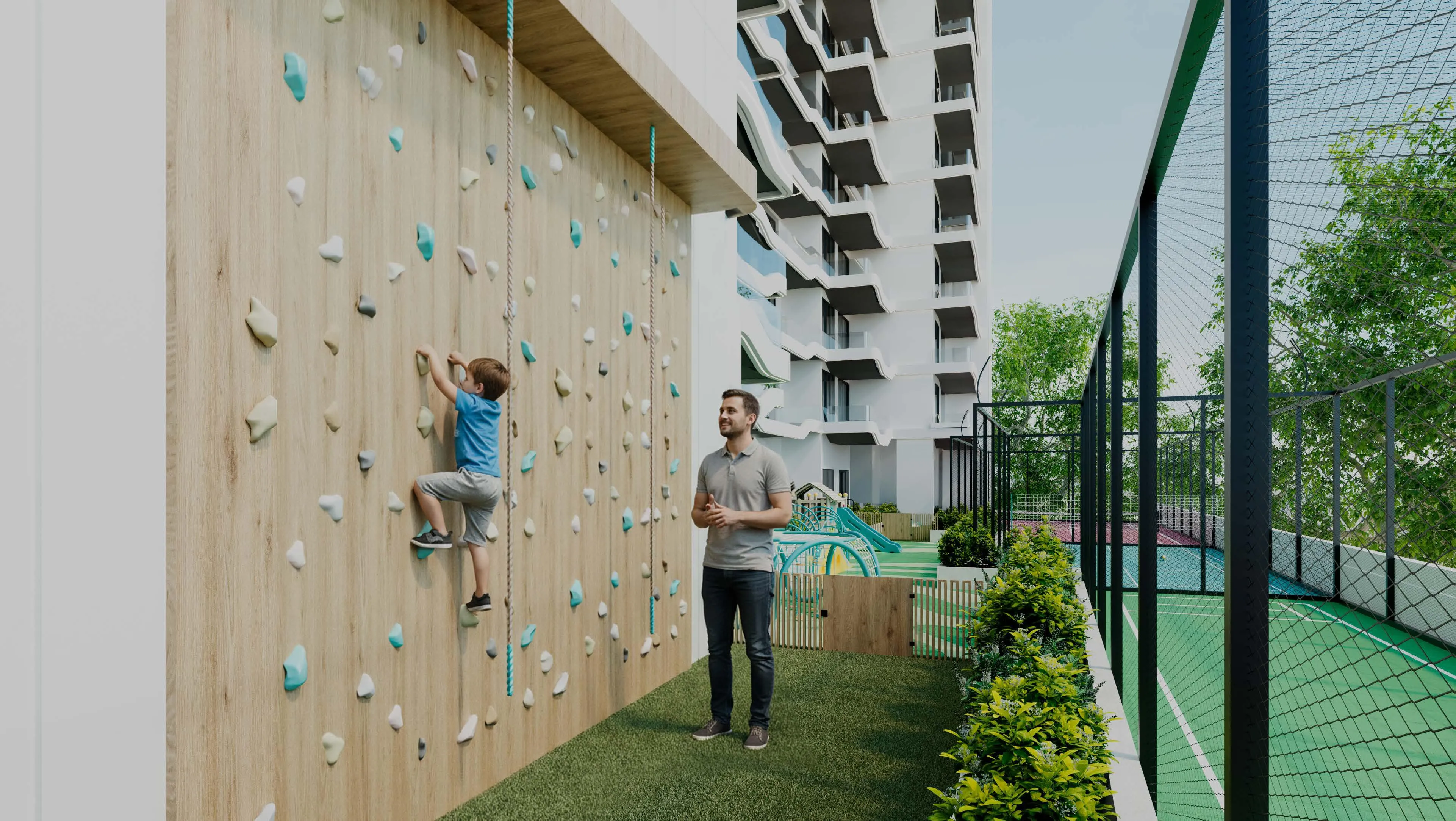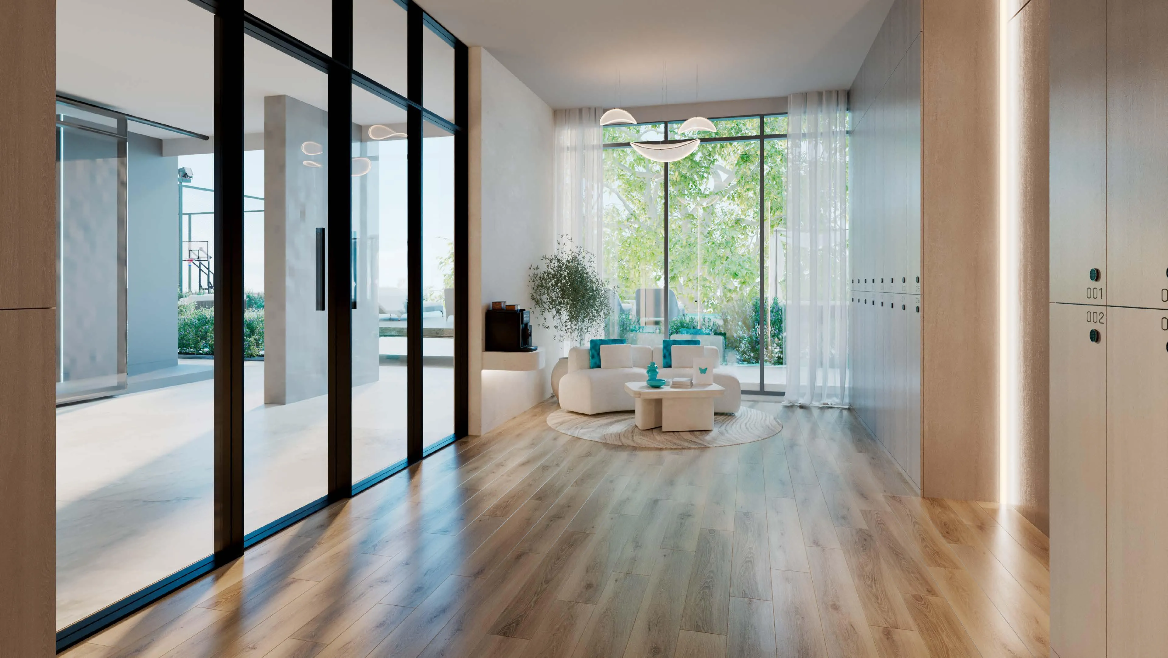 A rich collection of amenities elevates the residential experience, centered around the world’s first Outdoor-Cooled Garden Lounges — exclusive outdoor spaces crafted for comfort even in Dubai’s peak summer months. The development features cinema areas, BBQ zones, yoga and Pilates studios, a fully equipped gym, CrossFit area, an infinity pool with cabanas and a Baja shelf, kids’ pool, basketball and cricket courts, wall climbing facilities, badminton/volleyball courts, a cornhole court, tennis/padel court, and expansive kids’ play areas. The range of activities supports wellness, leisure, recreation, and social living for residents of all ages.