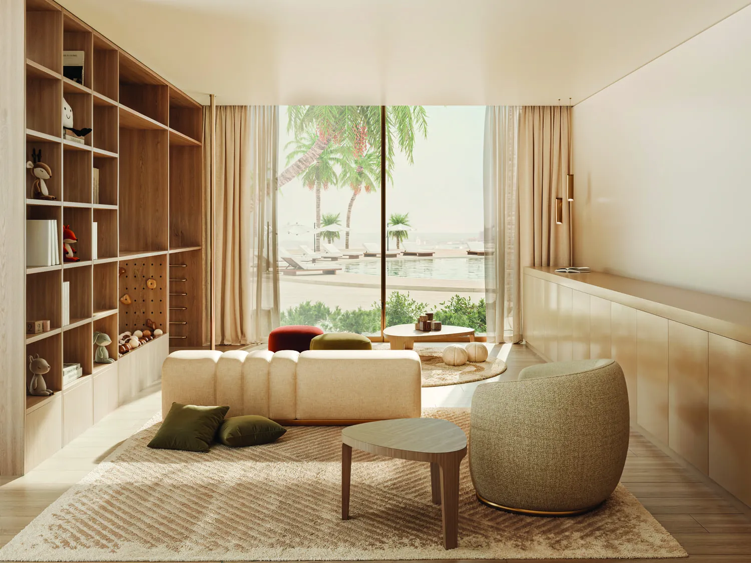Interiors reflect Elie Saab’s distinctive design language, characterized by refined material contrasts, soft tonal palettes, and sculptural detailing. Finishes include white travertine surfaces, light oak wood, and subtle bronzed accents, creating a warm yet contemporary atmosphere. Kitchens are designed as elegant, functional spaces with integrated cabinetry, stone countertops, and refined detailing that aligns with the overall interior aesthetic. Residences feature curated furnishings and décor from the Elie Saab Maison collection, crafted in Italy, offering a fully coordinated interior environment defined by timeless elegance, craftsmanship, and understated luxury.