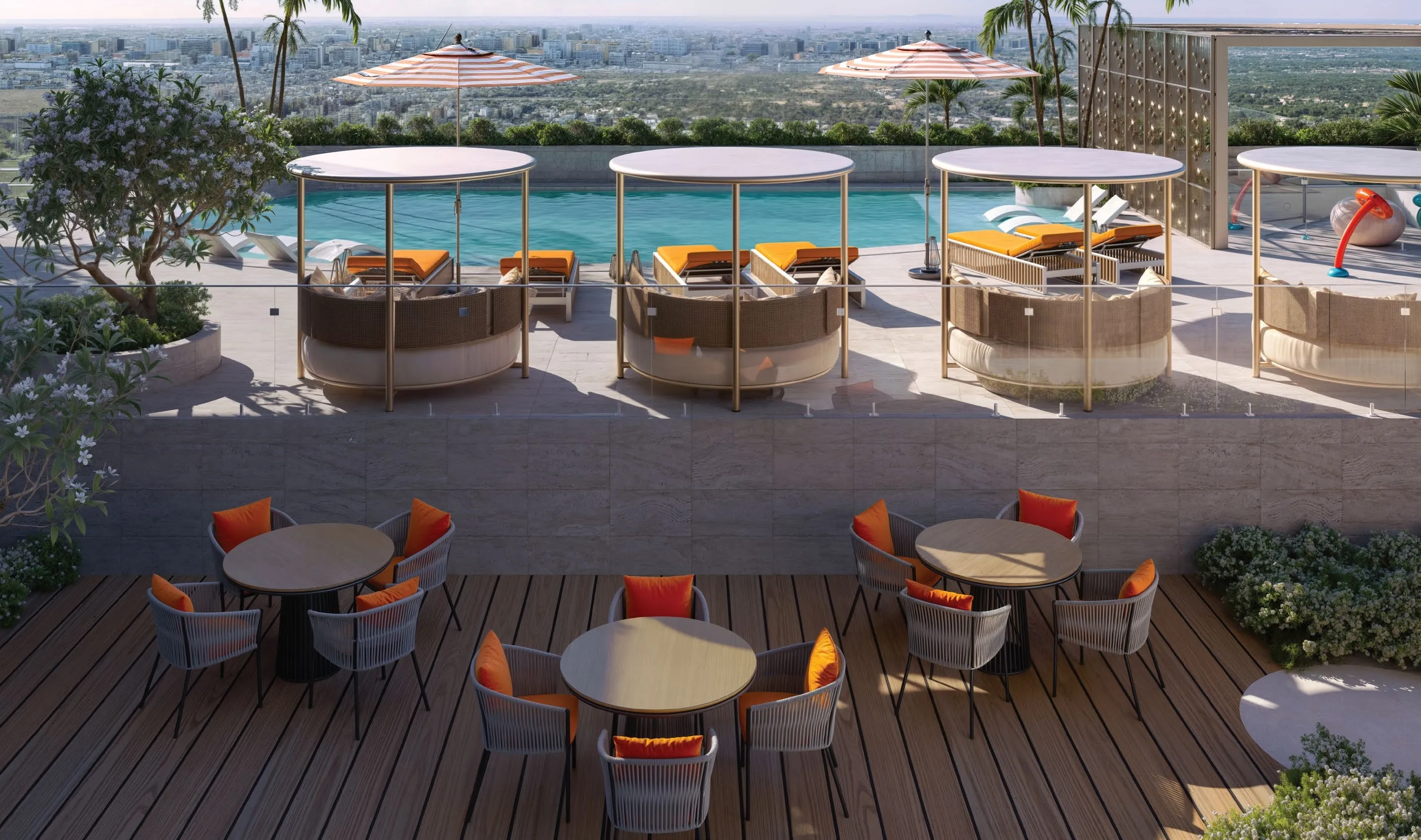 Residents enjoy a rich collection of amenities designed for both energy and relaxation, including a swimming pool with sun deck, kids’ pool, indoor and outdoor gyms, steam and sauna rooms, and a table tennis court. Social spaces such as the rooftop lounge, outdoor cinema, BBQ area, and cabanas create a perfect setting for gatherings and memorable evenings. Every amenity is thoughtfully planned to support an active, balanced, and enjoyable daily life.